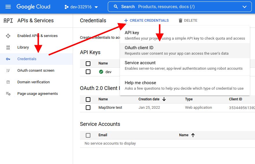 - Open the Google developer console and, from credentials section, create a new credential of type Oauth client ID