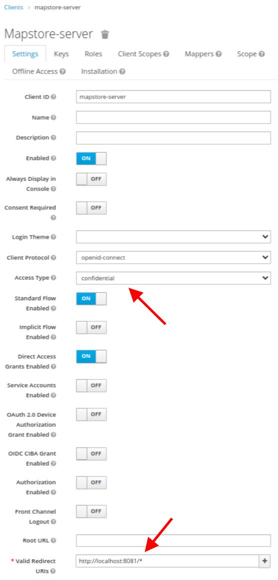Confidentialsetting the Redirect-URL with your MapStore base root, with a*at the end (e.g.https://my.mapstore.site.com/mapstore/*)