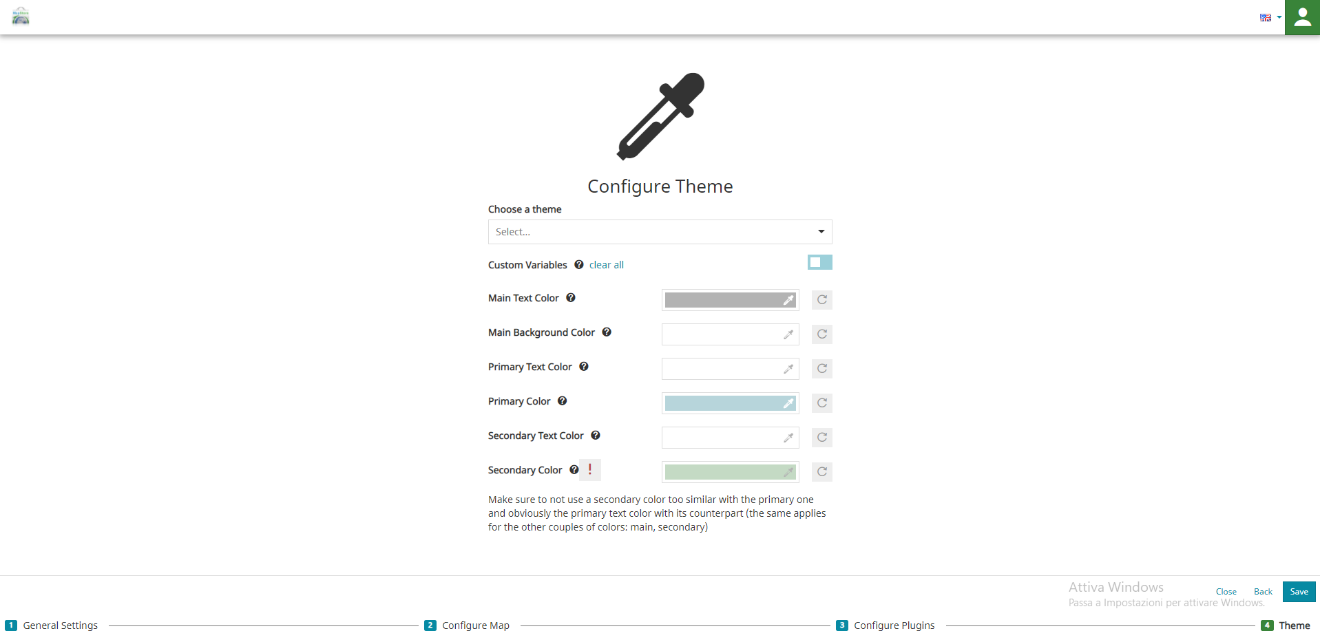 Once Custom Variables is enabled, the context editor can modify main, primary and secondary colors for both backgrounds and texts (an helper clarifies the UI elements involved for each field in the form). Clicking on the Change Color button