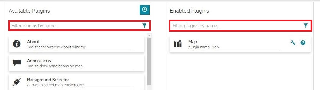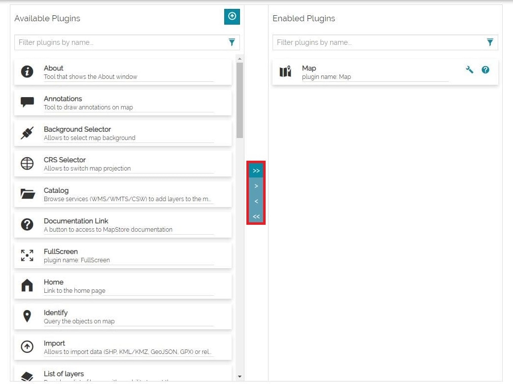 This wizard step allows to select the extensions that will be available in the context viewer: the user of a context will use only the plugins enabled by the user. Within this wizard step, all the available plugins in MapStore are present in the left side list ready to be selected for the context . The right side list contains the list of plugins selected by the user for the context.
