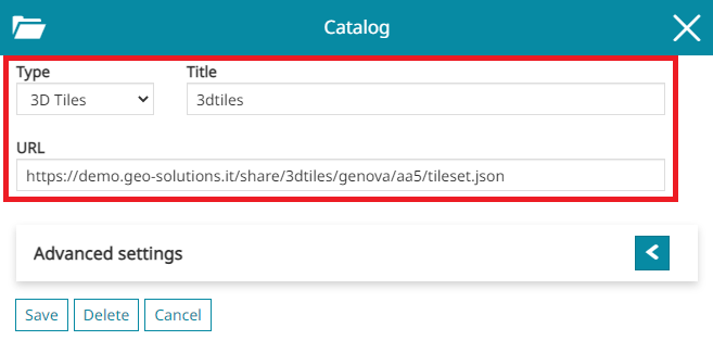 MapStore allows to publish 3D Tiles contents in its 3D mode on top of the CesiumJS capabilities. Through the Catalog tool, a specific source type to load 3D Tiles in the Cesium Map can be configured as follows by specifying the URL of a reachable tileset.json.