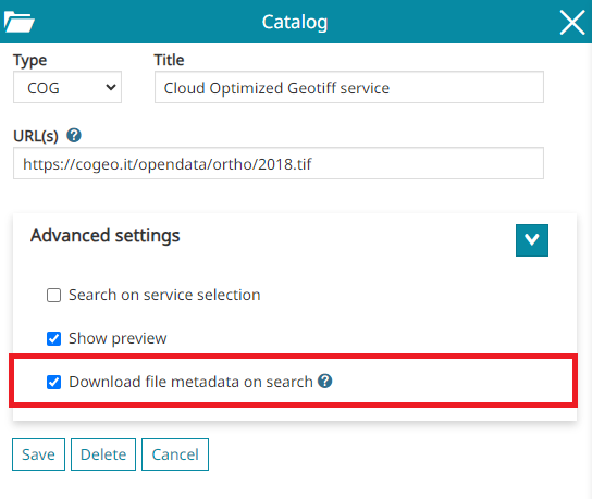 In addition to the standard options, only for COG catalog sources, through the Advanced Settings the user can configure also the following option: