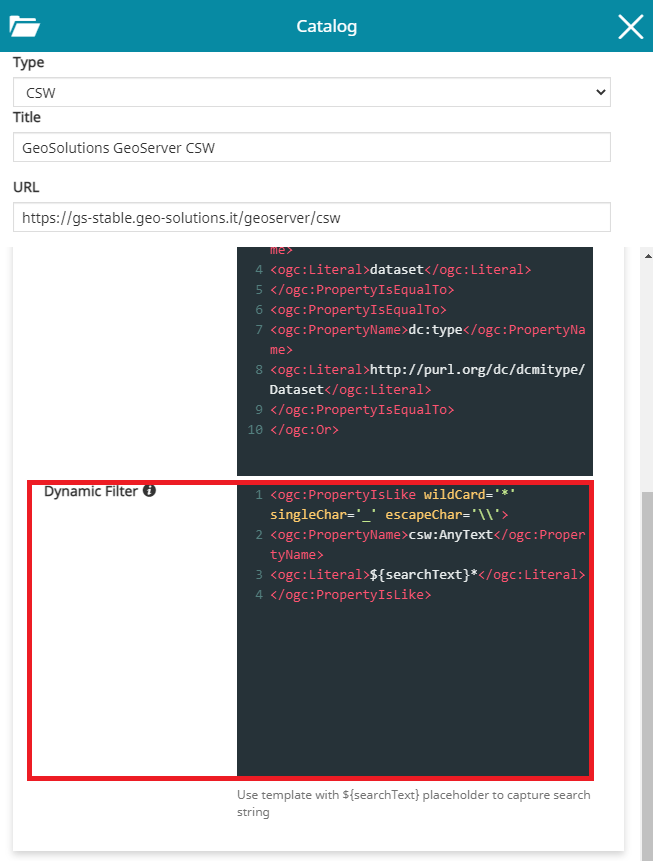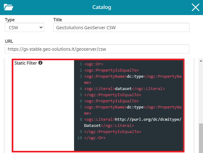 From the Advanced Settings of the CSW catalog the user has the possibility to configure a Static Filter and a Dynamic Filter to customize the search request.