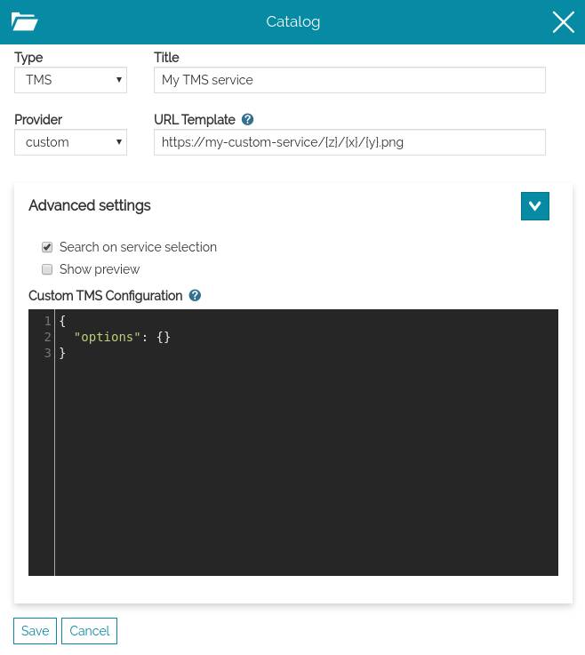 - Custom TMS service, specifying the URL template for the tiles.