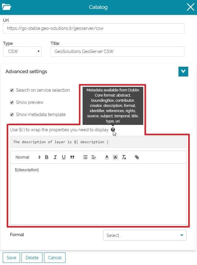 Enabling the Show metadata template option appears a text editor through witch it is possible to insert the custom metadata information for that service. In order to dynamically parse each layer's metadata value the user can insert the desired properties name with the format ${property_name}:
