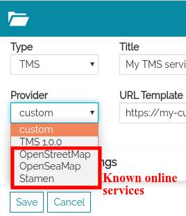 The Tile Map Service (TMS) specifications include some not official/not standard protocol for serving maps as tiles (i.e. splitting map up into a pyramid of images at multiple zoom levels). MapStore allows to add to the map the following services providers: