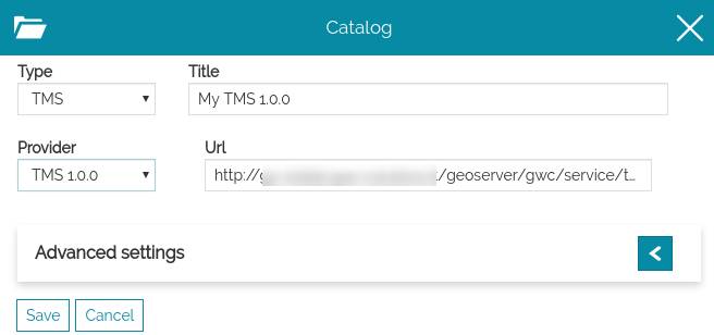Selecting the "TMS 1.0.0" provider the user can insert the URL of the Tile Map Service (see TMS Specification). For instance, in GeoServer, it is the URL of the "TMS" link in the home page.