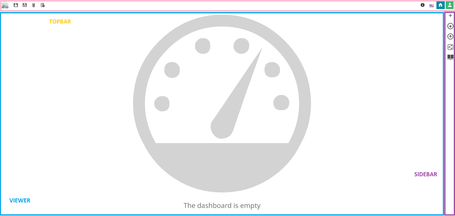 button in Homepage. With a click on it, an empty dashboard workspace appears. This page is composed of a Top Toolbar, a Sidebar and a Viewer*: