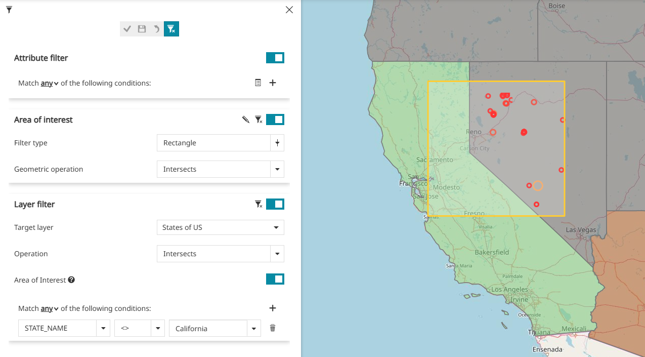 The following example shows this workflow: the meteorites layer is filtered using a square area of interest, and then a second filter excludes features located in the state of California by using the USA States layer. It is also worth clarifying that the AOI thus defined is used in this case to also restrict the Layer Filter's action to that area only.