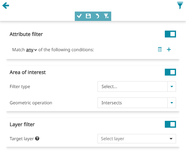 This filter allows to set one or more conditions referred to the Attribute Table fields.
