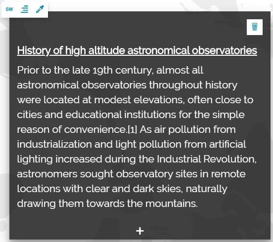 Adding a media content, the Media Editor appears to allow the story editor to add an Image, a Map or a Video. It is also possible to add a Web Page content as it is explained in the Web Page Section. An example of immersive content with a text and an image can be the following: