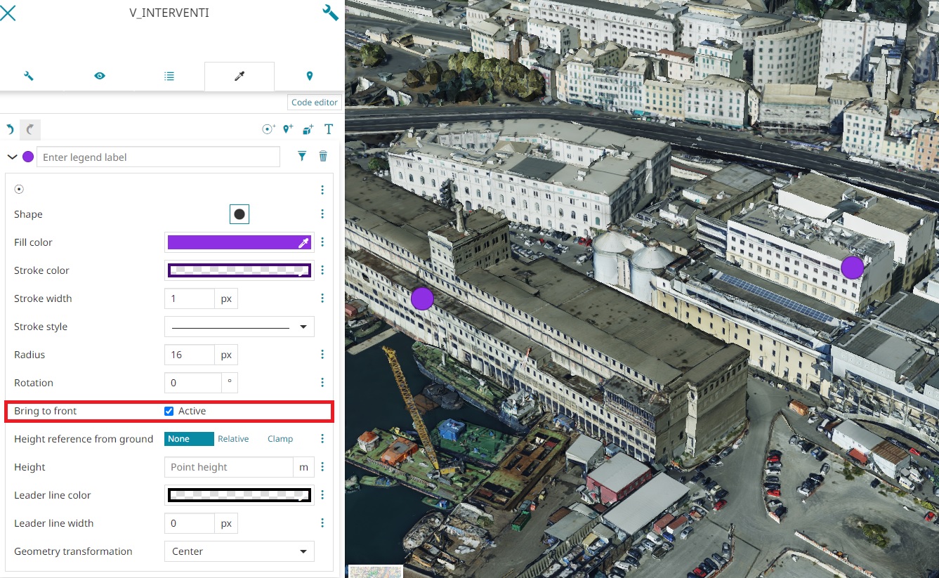 - Bring to front (available for Icon, Mark and 3D model symbolizers) to bring in front and so to make visible (if enabled) all features covered by 3D Tile layers and the Terrain layer (for this last case when the depth test against terrain option is enabled in Global Settings).