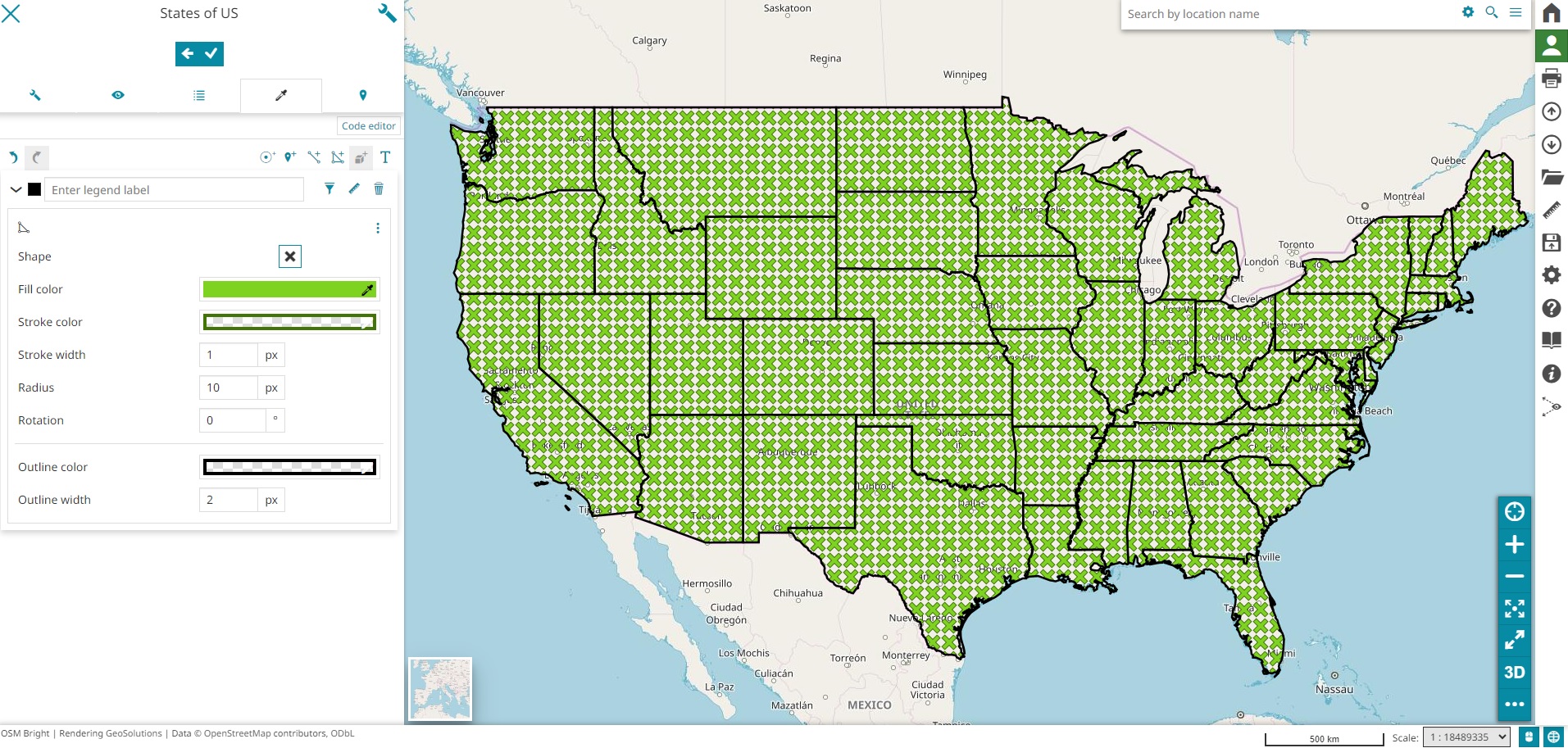 The style editor can configure the Icon as explained here along with the usual options available for rules of type line or fill depending on the selected symbolizer. Take a look at the following example of Pattern icon style for a Fill rule sample.