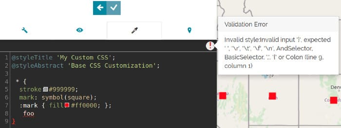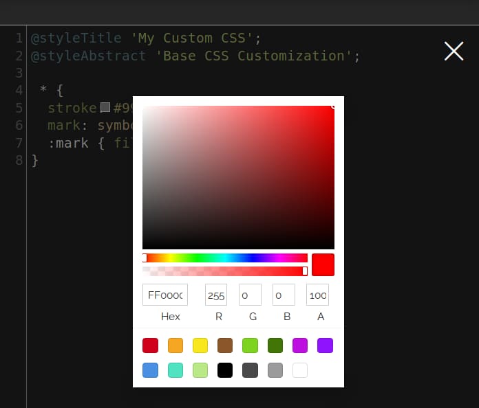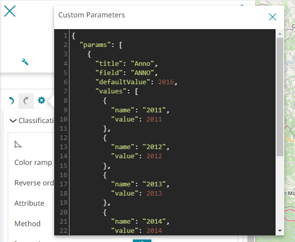 Here the user can add custom parameters that will be visible in the Visual Style Editor, above the Color Palette option. The Custom Parameters requires an array of fields to be configured according to the available viewparams defined in the SQL View.