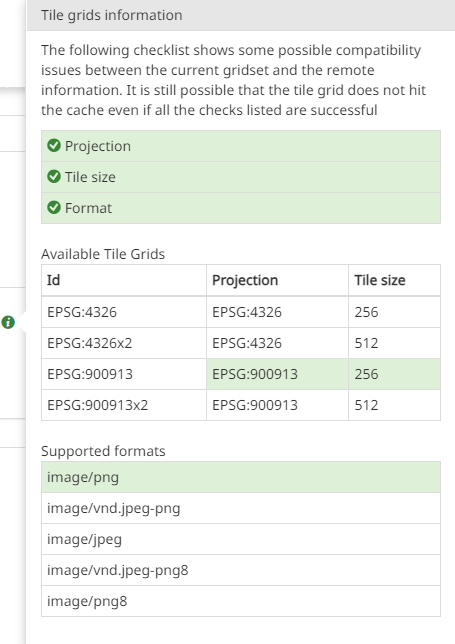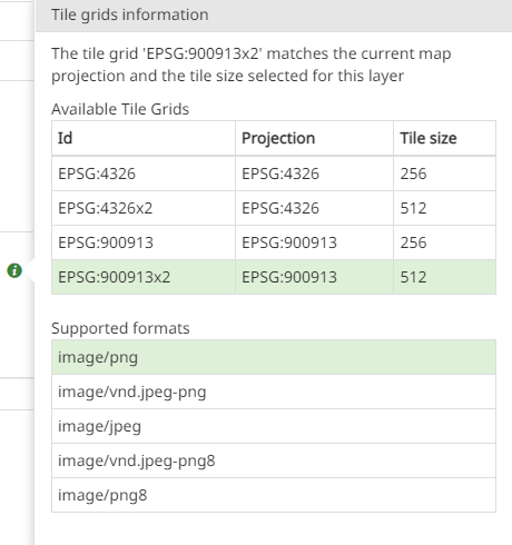 appears to inform the user if the current map settings (Projection, Tile size, Image Format) are properly matching the ones of the given Tile Grids defined on the server side configuration for the layer.