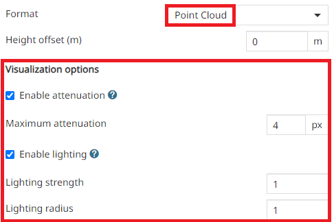 3D ModelandPoint Cloud. The Point Cloud option allows the user to customize theMaximum Attenuationof the points based on the distance from the current viewpoint and customize theLighting strengthand theLighting radiusto improve visualization of the point cloud.