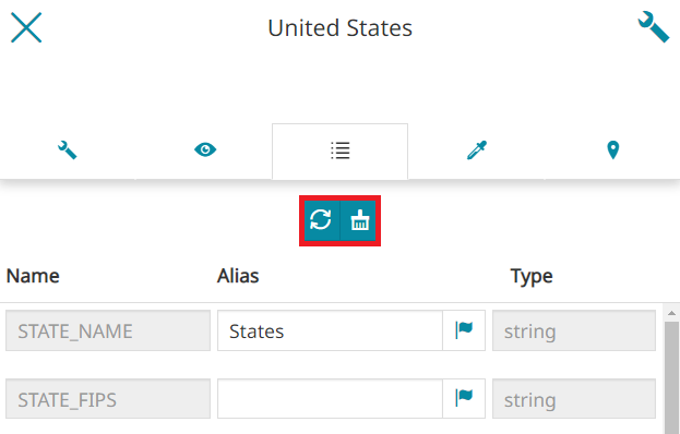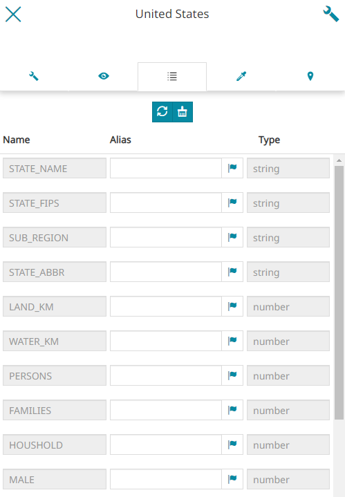 From this section of the Settings panel, MapStore allows the user to add aliases to layer fields.