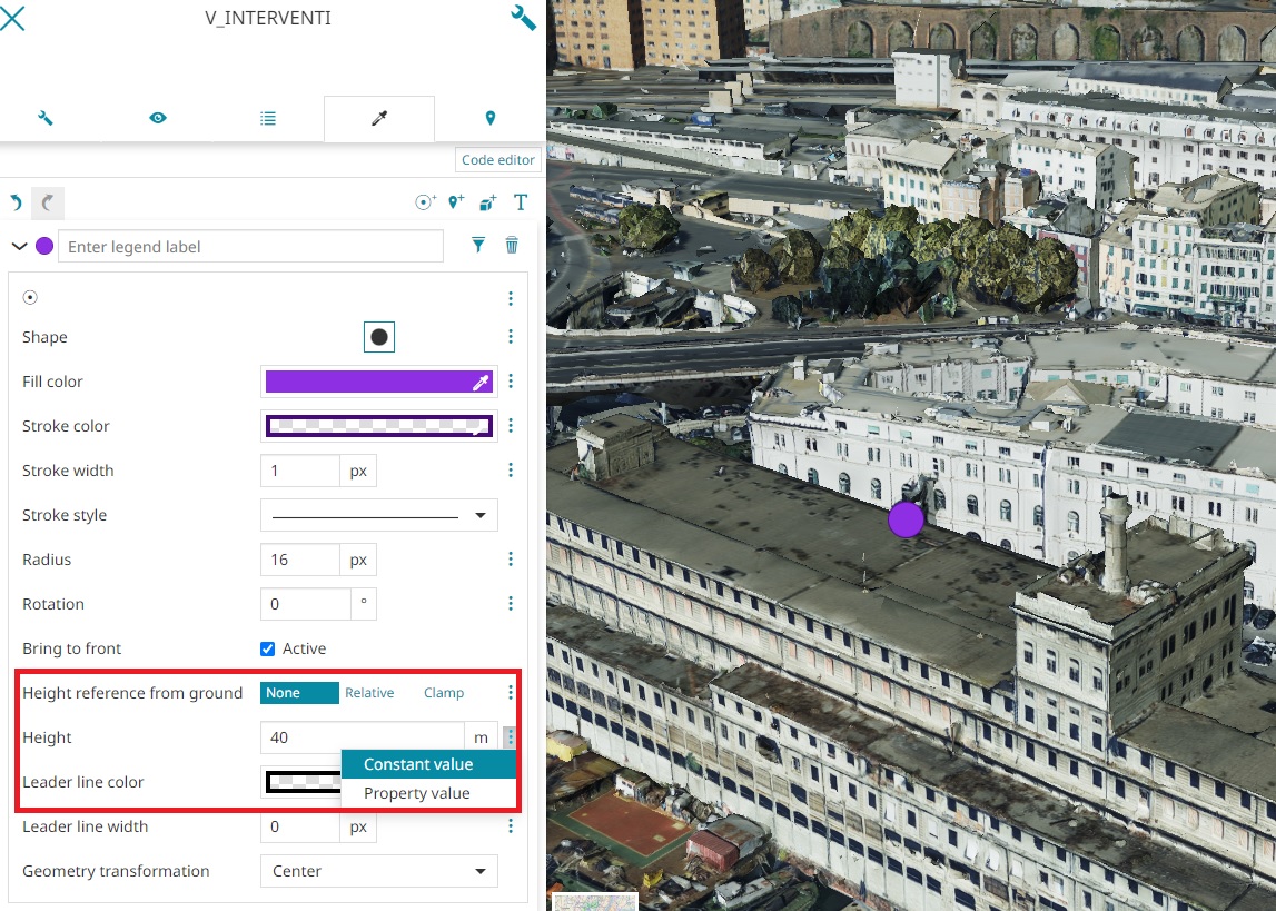 None(to the absolute zero of the ground),Relative(to the terrain layer level) orClamp(the feature is clamped to the Terrain, if present, or to the ground). It is also possible to finely configure the Height value of the point symbols by choosing between one of the attributes of the feature (where Point height indicates the intrinsic height of the feature geometry) selecting Attribute Value or choosing Constant Value that allows to set the raw value of the height.