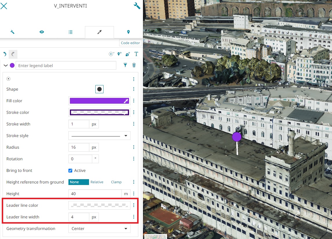 - Leader line (available for Mark, Icon, 3D Model and Text symbolizers) to add a line to connect the point symbol with the Terrain/Ground to have a more clear reference of the effective point position when the camera orientation change. The editor can choose the Width of the line and the Color through the usual color picker.