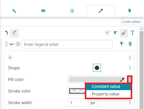 By default, Constant value is selected. If the user chooses Property value, a drop-down menu appears so that the desired layer attribute can be selected to use its values for the styling property.