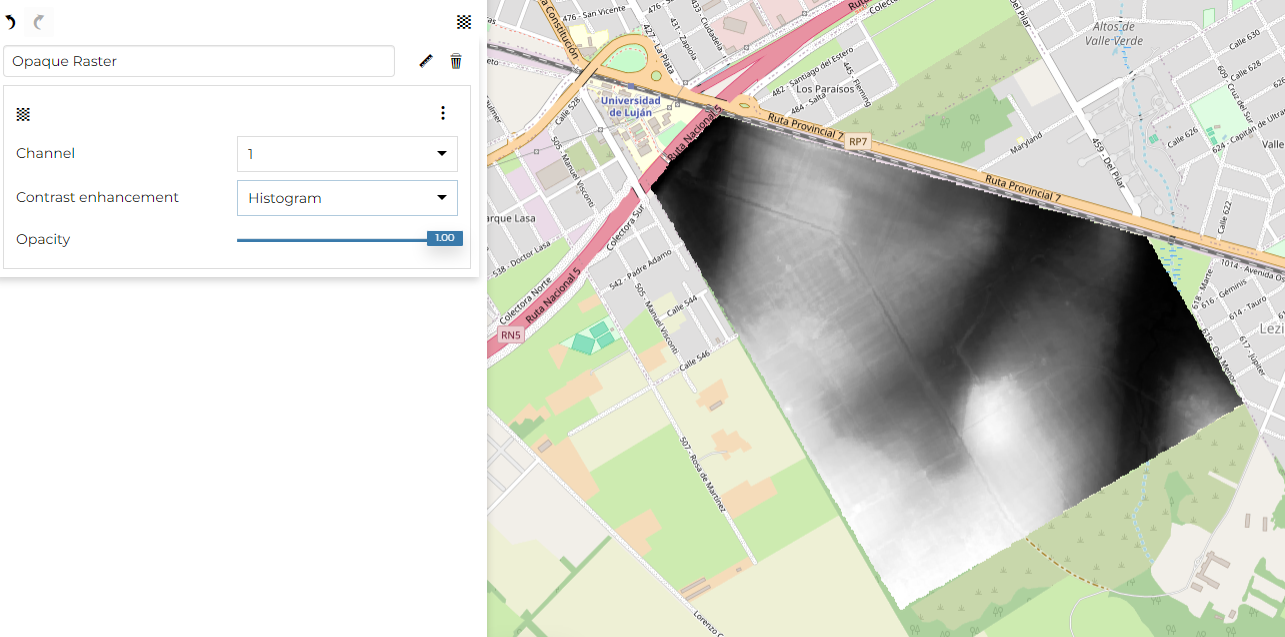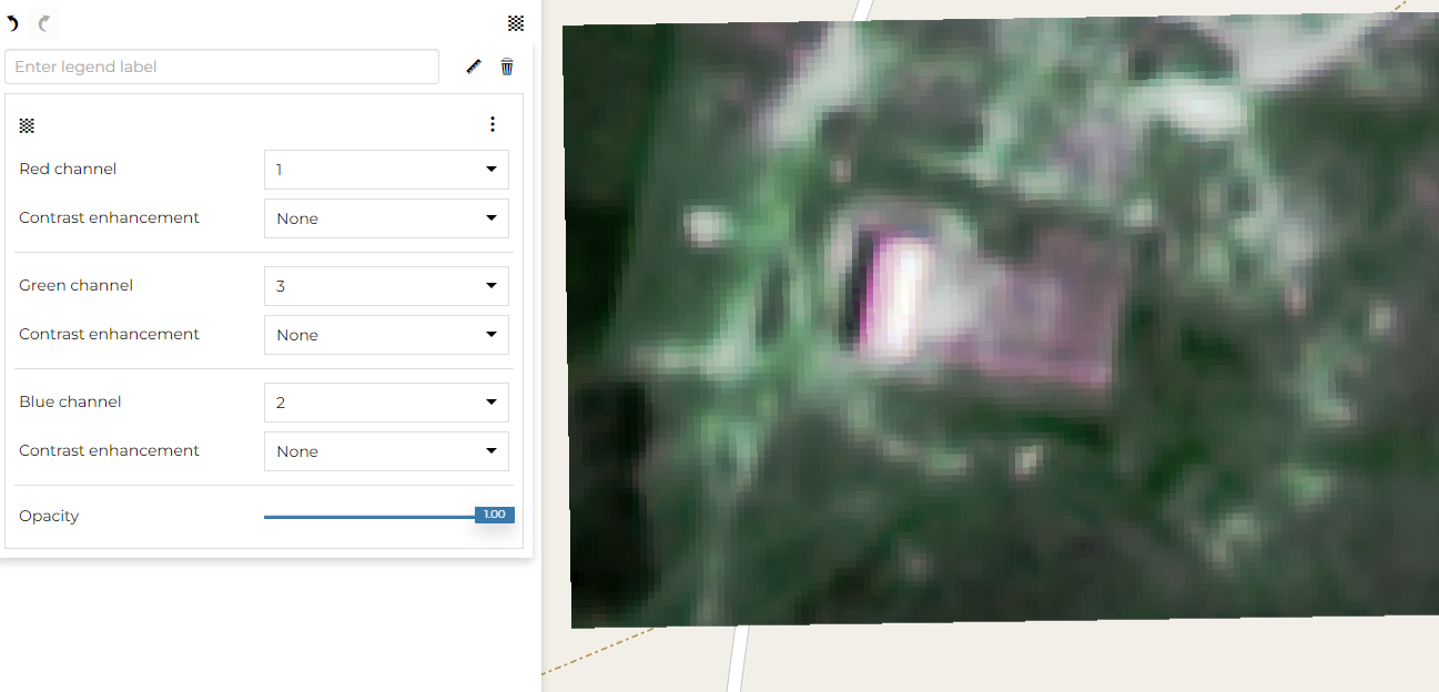 The Single band is the default one and here the user can choose the Channel to customize selecting the Contrast enhancement choosing between None, Normalize and Histogram and the change the Opacity. Take a look at the following example.