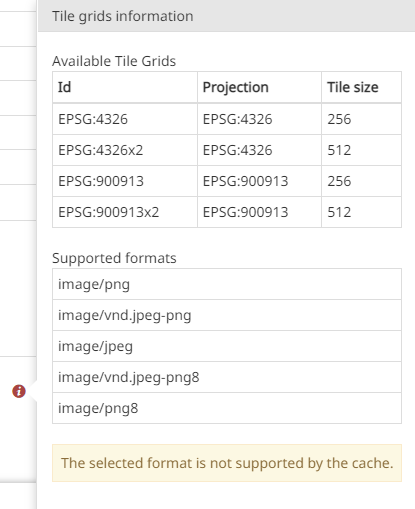 In case the current map/layer settings (Projection, Tile size, Image Format) do not match any of the server-side defined Tile Grids for the given layer the Info panel shows a warning message to indicate the reason for the mismatch so that it is possible for the user to change the needed setting accordingly (for example changing the map projection or selecting a different tile size and/or tile format).