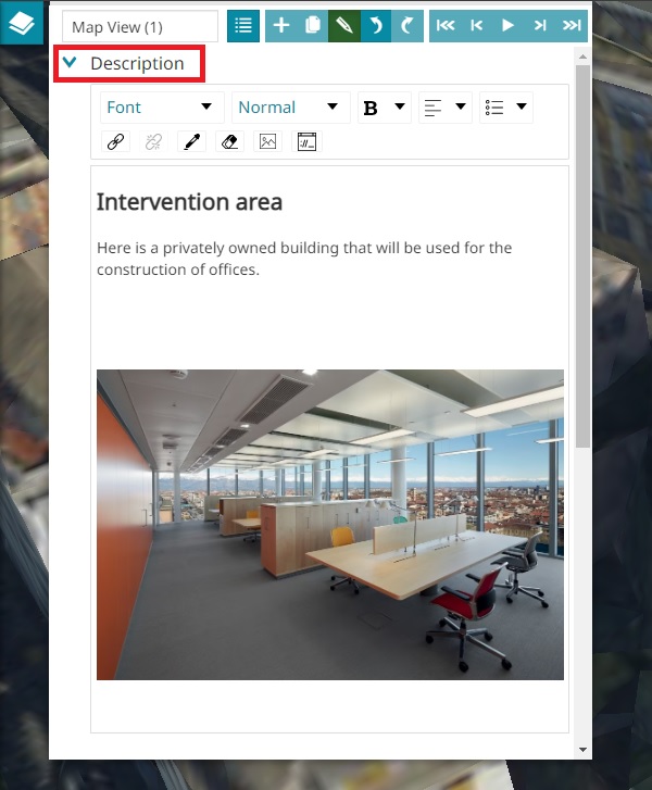 - Add a text, images, videos or hyperlinks through the Description section. The description is visible during the Views Navigation. Take a look at the following example.