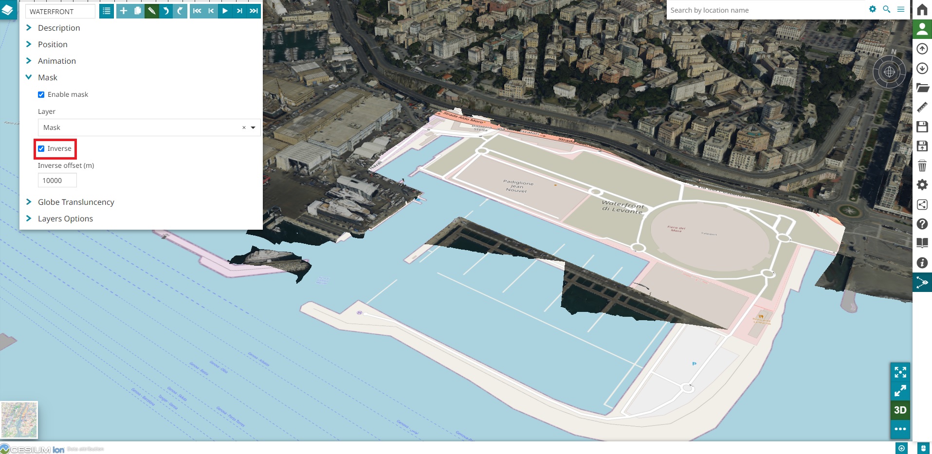 If the user enables the Inverse option, simply the inverse mask is applied using the same layer so that each feature is used to produce an hole on all visible 3D Tiles.