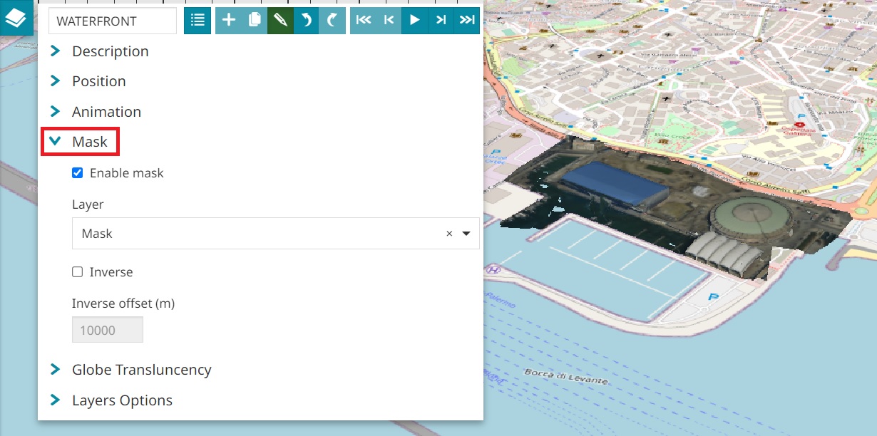 - When in 3D mode, use the Mask section to select a WFS or Vector layer available in TOC to create a mask on all the 3D tiles visible in map. The mask layer need to be added to the map before using this functionality so that it is possible to use the layer features as masking areas: if multiple WFS or Vector layers (with polygonal features) are present in the map, these are used all merged together to represent the final masking areas.