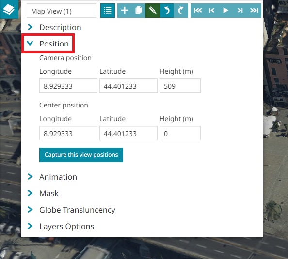 button or change the longitude, latitude and height of the Camera Position and Center Position (only available for the 3D mode) by using the Position section.