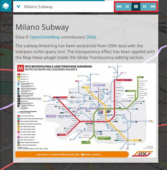 button. Doing that the presentation mode starts and each view is displayed in the Map Viewer, together with its descriptive panel (if configured) on the left side of the screen, for a time depended on the duration previously configured.