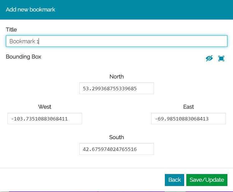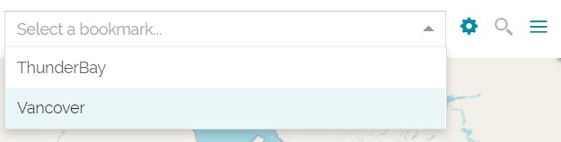 MapStore allows the user to search by the preconfigured bookmarks, which can zoom to a specific bounding box area or zoom along with reloading the visibility of the layers. Selecting the Bookmark settings