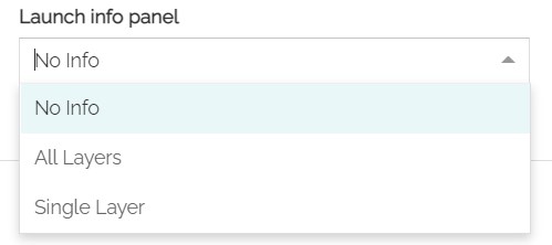 The Launch Info panel allows the user to chose if and how the custom search interact with the Identify tool. In particular, with the No Info option, the Info panel doesn't show up once a record from the search results is selected. Selecting All Layers or Single Layer the Identify tool is triggered, and the related panel opens displaying the information of all/single layer(s) visible in the map. With Single Layer instead, the Identify tool is triggered only for the layer (if it is present and visible in the map) related to the selected record in the search result list.