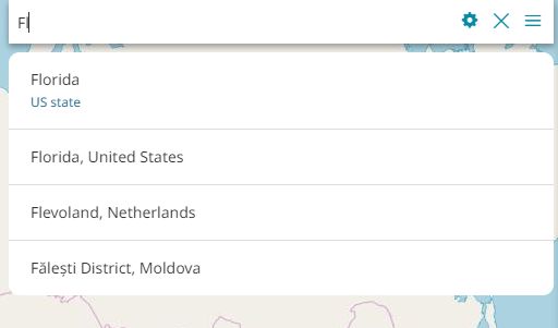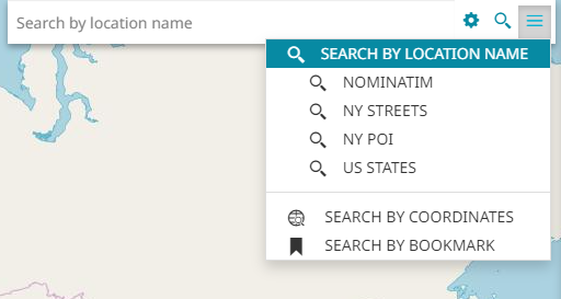 When there are multiple search services defined, by default MapStore performs the search operation on all of them according to the priority configured for each service (see above). Therefore, it is also possible for the user to select the desired search service from the menu to perform the search only on it. Selecting the Search Service Menu button