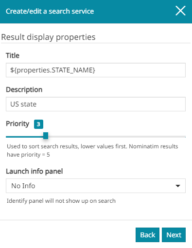 The Priority, a parameter which determines the position of the records in the results list. Lower values imply a higher positions in the results list and vice versa. By default the OpenStreetMap Nominatim search engine result has priority equals to 5, therefore in order to see the custom results in a higher position a lower priority value is needed