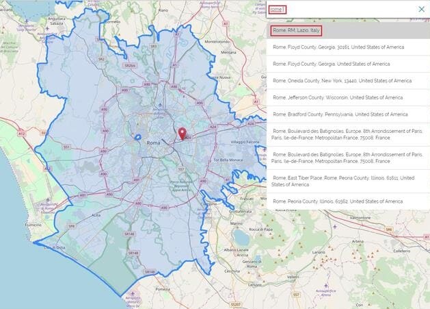 The Search by location name, set by default when a new map is created, allows the user to search places asking the OpenStreetMap Nominatim search engine. Typing the desired place, the Nominatim seach engine is queried; selecting then the desired record in the list of results, the map is automatically re-center/zoomed to the chosen area that is also highlighted: