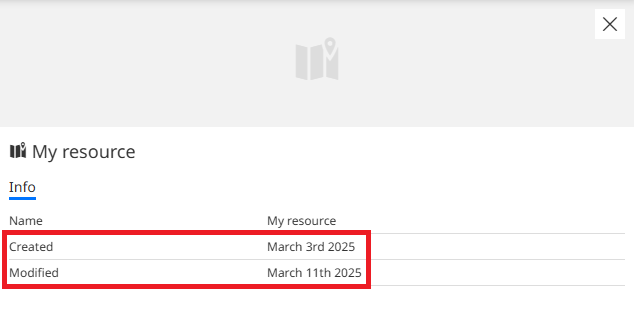 From the Properties panel the user can view the resource information through the Info tab, the resource's permissions, if the user has edit permissions on the resource, through the Permissions tab and the resource details through the About tab.