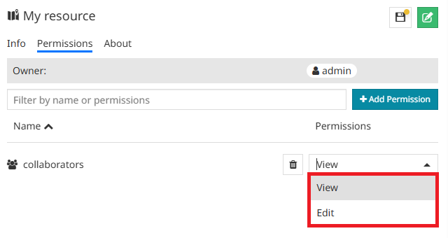 Once the selected group is on the Permissions Groups list, the user can choose between View and Edit permission option.