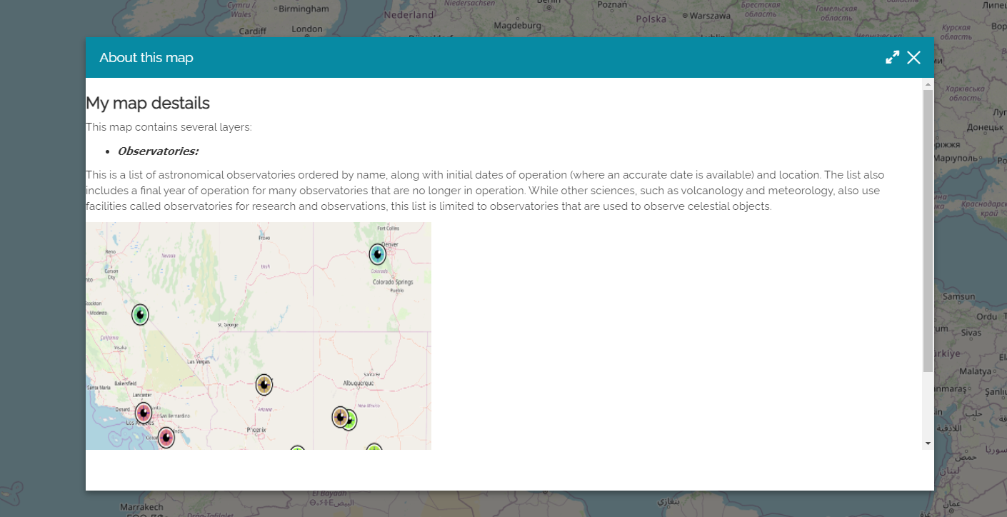 If the Show as modal button is not activated once the user opens the About this map button, the details are displayed on a panel.