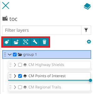 available in the toolbar. It appears once a layer is selected in TOC. This button opens a panel where the user can choose the destination group:
